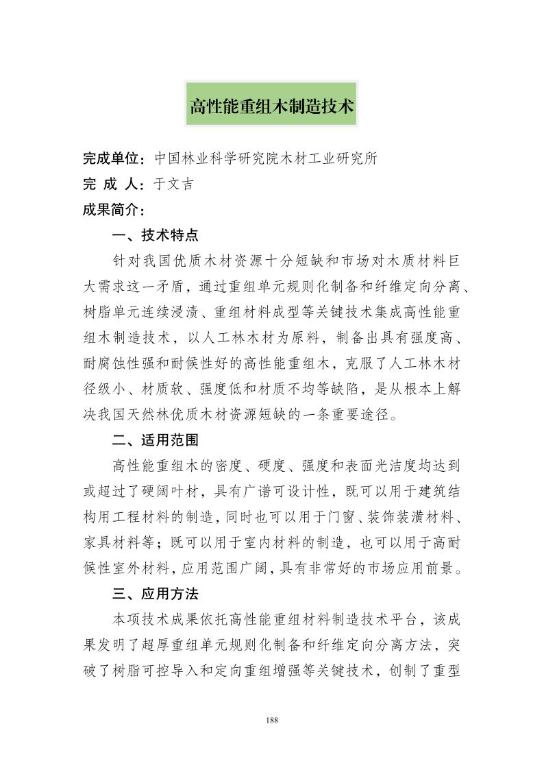 近日,為全面落實(shí)深化集體林權(quán)制度改革任務(wù),切實(shí)發(fā)揮先進(jìn)實(shí)用技術(shù)對集體林區(qū)興林富民的促進(jìn)作用,國家林業(yè)和草原局聚焦林木良種、森林經(jīng)營、林下經(jīng)濟(jì)、木本糧油、林業(yè)機(jī)械、木竹加工、林產(chǎn)化學(xué)、信息監(jiān)測等 8 個領(lǐng)域,組織遴選出集體林權(quán)制度改革重點(diǎn)推廣科技成果 73 項(xiàng)。于文吉首席科學(xué)家團(tuán)隊(duì)“高性能重組木制造技術(shù)”和“大規(guī)格耐候性竹質(zhì)重組結(jié)構(gòu)材制造技術(shù)”2項(xiàng)科技成果入選。