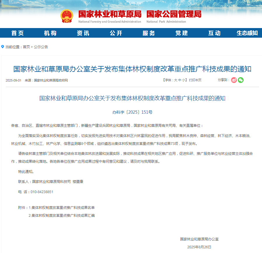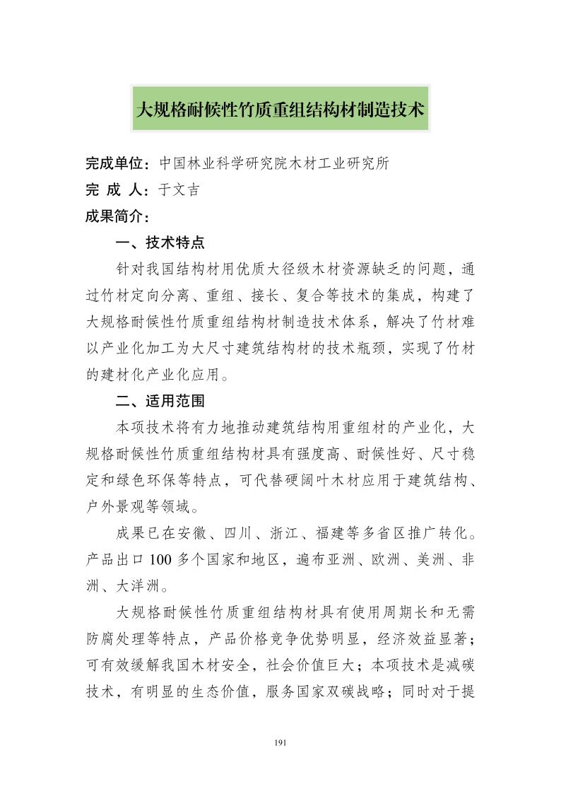 近日,為全面落實深化集體林權(quán)制度改革任務,切實發(fā)揮先進實用技術(shù)對集體林區(qū)興林富民的促進作用,國家林業(yè)和草原局聚焦林木良種、森林經(jīng)營、林下經(jīng)濟、木本糧油、林業(yè)機械、木竹加工、林產(chǎn)化學、信息監(jiān)測等 8 個領(lǐng)域,組織遴選出集體林權(quán)制度改革重點推廣科技成果 73 項。于文吉首席科學家團隊“高性能重組木制造技術(shù)”和“大規(guī)格耐候性竹質(zhì)重組結(jié)構(gòu)材制造技術(shù)”2項科技成果入選。